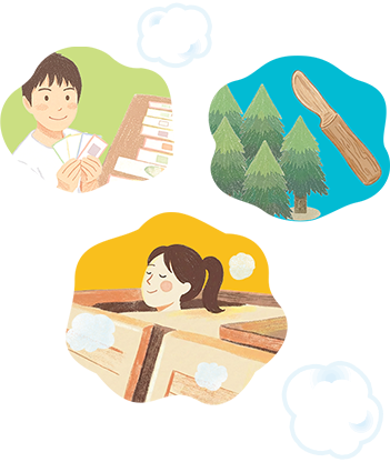 地熱でじっくり蒸した木ならではの、やわらかな手触りや奥行きのある色・香り・ツヤを感じながらオリジナルクラフトを制作します。小国の森の素材を使い、自分の手で仕上げた作品は世界にひとつだけ。自然の恵みを形にして、思い出とともにお持ち帰りいただけます。