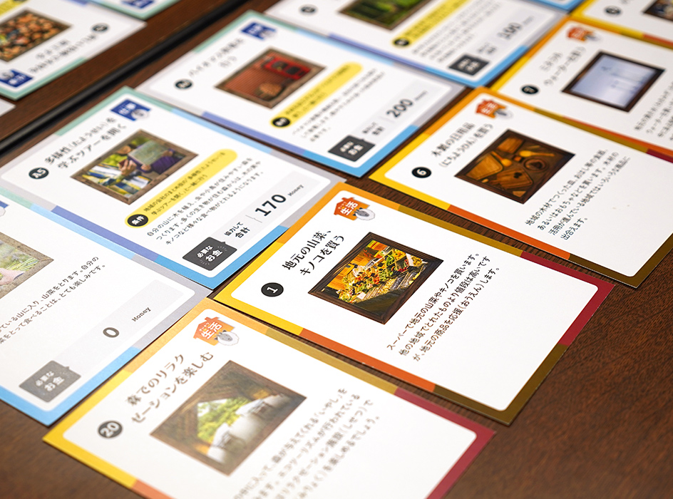 林業者・行政・商工会・メディアなど「森に関わる10の役割」に分かれ、それぞれが選ぶ「仕事」と「生活」のアクションによって、森や地域の20年後の未来がどう変化していくかをシミュレーションするカードゲームです。森林資源の循環や、森と人との関係、SDGsについて、大人も子どもも楽しみながら学べるプログラムです。