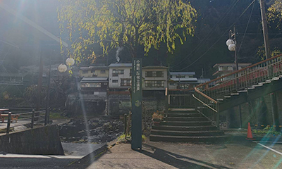 【目印】柳の木の側「杖立温泉」看板前